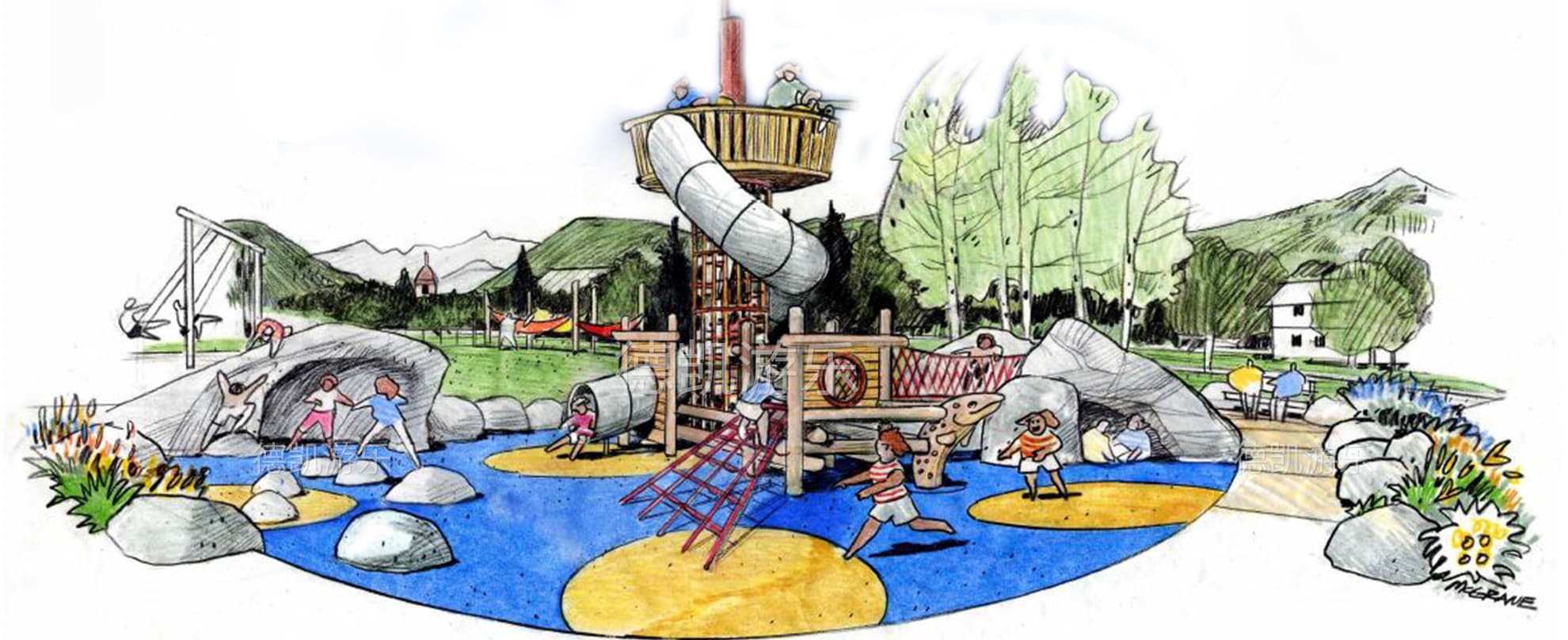 所以德凱設計團隊總是帶著一個問題去設計整個游樂場項目。孩子們想從這個游戲空間中得到什么?我們的目標是為每個孩子提供參與和愉悅的機會,盡可能提供游戲價值。隨著我們建立的每個新的游戲空間,我們傾聽并向我們創造的孩子們學習。德凱游樂擁有一支專業的場地規劃設計團隊,從實地測量到場地功能區劃,再從CAD制圖到3DMAX模型制作等每一個環節,工作人員都認真負責,場地規劃設計方案客戶滿意度高。每個游樂場設計都必須遵循六個設計原則:
